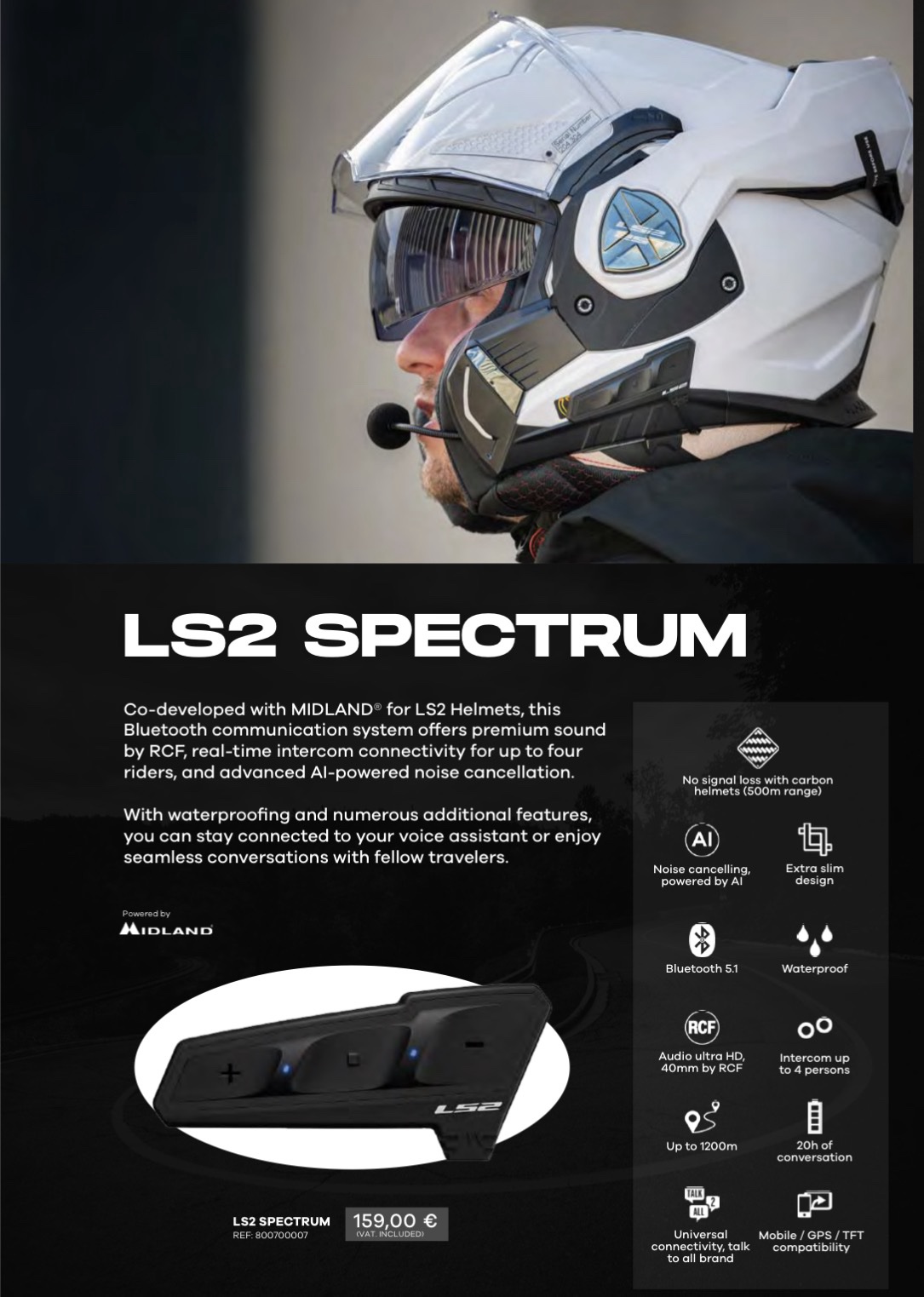 Développé conjointement avec MIDLAND pour les casques LS2, ce système de communication Bluetooth offre un son de qualité supérieure signé RCF, une connectivité intercom en temps réel pour un maximum de quatre pilotes et une annulation du bruit avancée alimentée par l’IA. Grâce à l’étanchéité et à de nombreuses fonctionnalités supplémentaires, vous pouvez rester connecté à votre assistant vocal ou profiter de conversations transparentes avec vos compagnons de voyage.